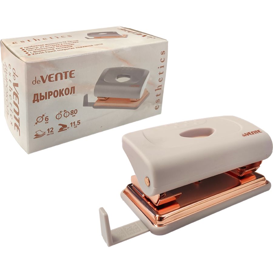 Дырокол "deVENTE. Esthetics" (12 листов) пластиковый с линейкой, в картонной коробке, цвет лавандово-пепельный, с металлической базой цвета розового золота