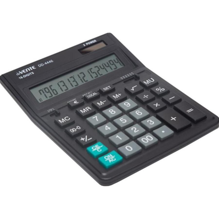 Калькулятор 16 разр., "deVENTE" DD-4446, 153x199x31 мм, 2-е питание, черный, автоматическое вычисление квадратного корня, процентов, наценки, автоматическая конвертация валют, клавиша "00" функция смены знака, коррекция последнего введенного значения, работа с памятью, автоматическое отключение, прорезиненные ножки, крупные клавиши, в картонной коробке