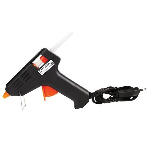 Пистолет клеевой предназначен для прочной фиксации поверхностей с помощью расплавленной клеевой массы. Заправляется специальным клеевым стержнем. С его помощью можно склеить дерево, пластик, резину, кожу, стекло, металл, ткань и др. Пистолет клеевой 40 Вт предназначен для прочной фиксации поверхностей с помощью расплавленной клеевой массы. Заправляется специальным клеевым стержнем диаметром 11 мм. Корпус изготовлен из ударопрочной пластмассы и имеет скобу для надежной установки в нерабочем положении. Принцип работы: клеевой стержень плавится в металлической камере с помощью нагревательного устройства, а при нажатии на курок происходит дозирование, и клей подаётся из сопла на склеиваемую поверхность. С его помощью можно склеить дерево, пластик, резину, кожу, стекло, металл (металлические изделия лучше перед работой разогревать феном), ткань, пенопласт, керамику, картон, бумагу, цветы или что-то другое. Используется малый клеевой пистолет в основном в быту, там где нужно что-то подклеить в небольшом объеме, например, для декорирования или изготовления упаковочной и сувенирной продукции. Удобен для работы с малогабаритными изделиями.