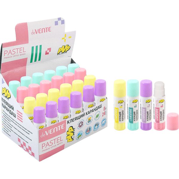 Клеящий карандаш PVP основа "deVENTE. Pastel" 08 г (быстросохнущий) в картонном дисплее с пластиковым поддоном, ассорти 4 пастельных цвета корпуса