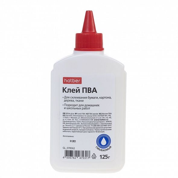 Клей ПВА отлично склеивает картон и бумагу, дерево, ткань и кожу. Подходит для использования в офисе, дома и в школе на уроках труда. Клей безопасен при использовании: не содержит растворителей, не оставляет следов и легко смывается водой. Подходит для детей старше 3-х лет. Он экономично расходуется благодаря дозатору, который обеспечивает точное нанесения клея на склеиваемые поверхности. Также клей устойчив к резким перепадам температур, выдерживает многократные замораживания и размораживания, сохраняя при этом потребительские свойства и однородность текстуры. Хранить при температуре выше +5 С.Объем: 125гр . Упакован в термоусадочную пленку по 10 шт.