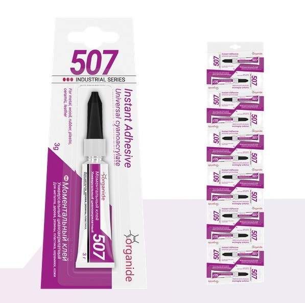 Клей универсальный ORGANIDE 507 Однокомпонентный моментальный клей для быстрого склеивания распространенных в быту материалов. Клеевое соединение устойчиво к органическим растворителям. Прочный клеевой шов. Срок годности 2 года. Универсальный этилцианакрилатный Склеивает металл, дерево, резину, пластик, керамику, кожу. Время склеивания 5-20 секунд