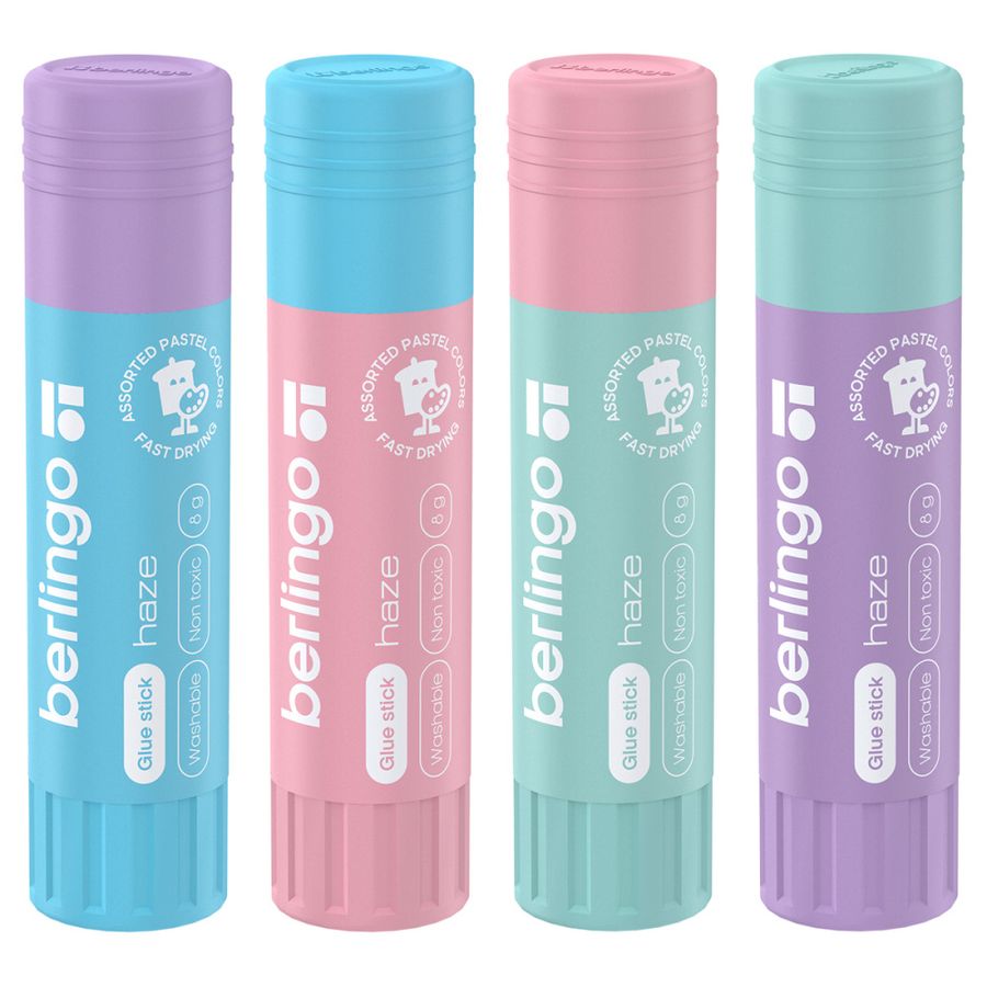 Клей-карандаш ПВП Berlingo Haze – отличный помощник для склеивания изделий из бумаги и картона, ткани, фотографии. Вес – 8 грамм. Клей имеет уникальную формулу на основе ПВП с добавлением цветового пигмента пастельного оттенка. Представлен в ассорти из 4 цветов: голубой, лиловый, розовый и бирюзовый. Не токсичен, не содержит растворителей. Не имеет неприятного запаха. Экономичен в использовании. Не деформирует бумагу и не оставляет следов после высыхания. Корпус имеет матовое покрытие и выполнен в дизайнах пастельных тонов. Упаковка – прозрачный дисплей-бокс. Является частью одноименной кросс-серии продукции бренда Berlingo.