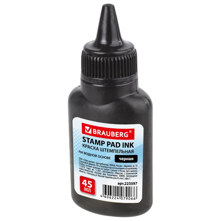 Штемпельная краска BRAUBERG предназначена для заправки штемпельных подушек, используемых для всех видов ручных и автоматических оснасток печатей, штампов, нумераторов и датеров. Оттиск штампа можно наносить на все виды бумаги, кроме глянцевой. Высококачественные чернила черного цвета на водной основе. Время высыхания оттиска - 30 секунд. Удобный пластиковый флакон с дозатором. Объем - 45 мл. Штемпельная краска BRAUBERG незаменима для работы с документацией. Покупайте товары для офиса в нашем интернет-магазине по выгодным ценам!