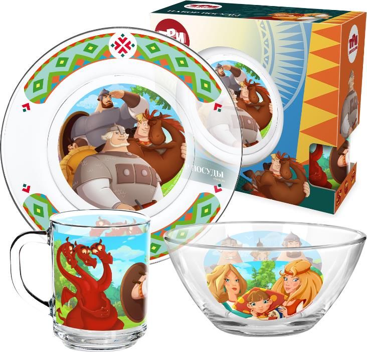 Набор посуды "Три Богатыря", Дизайн 2 (3 предмета, подарочная упаковка), стекло. Не подвергать длительному воздействию прямых солнечных лучей, не использовать в СВЧ, духовом шкафу, на открытом огне, не замораживать в морозильной камере, мыть перед использованием, ручная мойка без использования абразивных веществ.