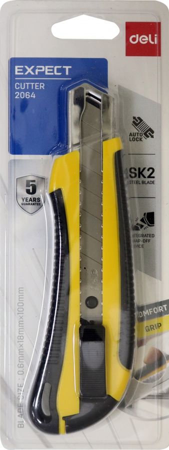 Канцелярский усиленный нож Deli предназначен для разрезания по заданному рисунку или контуру бумаги, картона, более плотных материалов. Может использоваться при отрезании ковролина или линолеума. Ширина лезвия: 1.8 см. Размеры: 0,6мм х 18мм х 100 мм. С фиксатором. Прорезиненная рукоять. Материал: сталь. Тип упаковки: блистер. Цвет в ассортименте.