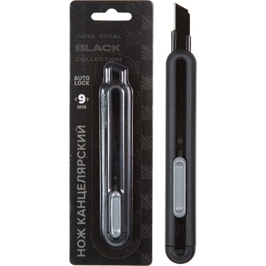 Нож канцелярский "deVENTE. TOTAL BLACK" 09 мм, 12,6 см, металлическое направляющее, черный корпус с серыми элементами, черное лезвие, автоматическая система фиксации лезвия, пластиковый блистер, с индивидуальной маркировкой