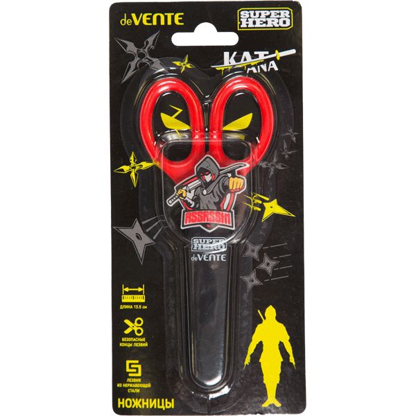 Ножницы детские "deVENTE. SuperHero. Assassin" 13,5 см, пластиковые кольца, защитный футляр с каучуковым декоративным элементом, черные с красным, в картонном блистере