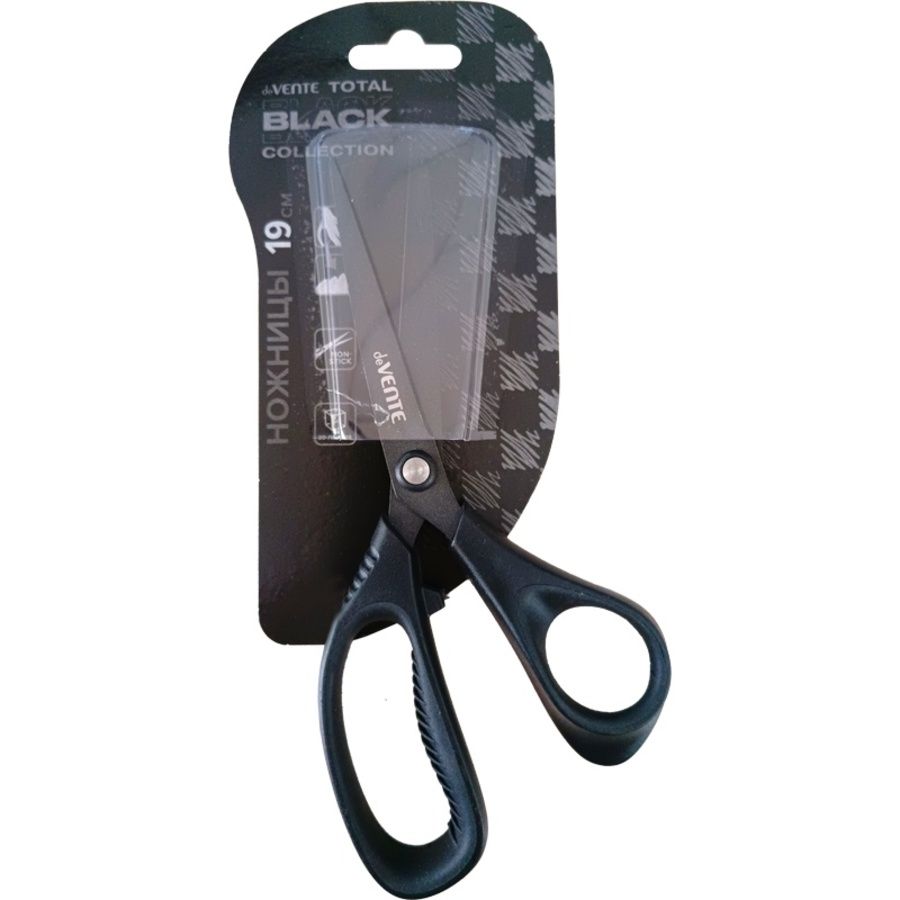 Ножницы канцелярские "deVENTE. TOTAL BLACK" 19 см, черные прорезиненные кольца с лепестками, 3D лезвия, тефлоновое покрытие лезвий, в картонном блистере.