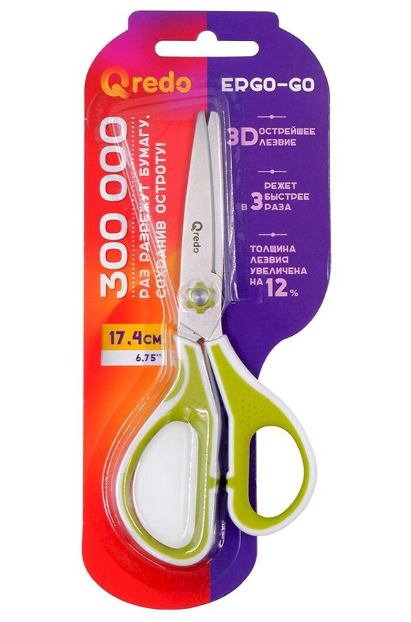 Ножницы Qredo имеют острейшее 3D лезвие, легко и плавно разрезают бумагу без дополнительных усилий. Могут использоваться для более плотных материалов. Тупоконечная форма снижает вероятность получения травм. Изготовлены из нержавеющей стали. Пластиковые ручки оснащены прорезиненными вставками, предотвращают скольжение пальцев во время использования. Эргономичная форма ручек снижает напряжение в руке, способствует естественному положению пальцев, облегчает маневрирование в процессе вырезания мелких фрагментов. Цвет ручек зеленый с белым. Длина 174 мм. Ножницы поставляются в безопасной пластиковой упаковке на картонной подложке с европодвесом.