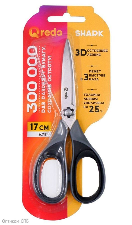 Ножницы Qredo имеют острейшее 3D лезвие, легко и плавно разрезают бумагу без дополнительных усилий. Толщина лезвий увеличина на 25%, могут использоваться для более плотных материалов. Тупоконечная форма снижает вероятность получения травм. Изготовлены из нержавеющей стали. Цвет ручек черный с серым. Длина 170 мм. Ножницы поставляются в безопасной пластиковой упаковке на картонной подложке с европодвесом.