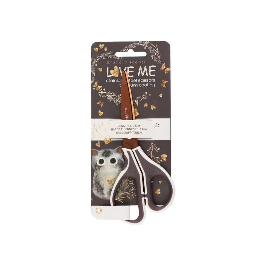 Ножницы из нержавеющей стали с титановым покрытием «Love me.Котенок» ТМ Bruno Visconti — это сочетание стильного дизайна, отменного качества и высокой функциональности. Их продуманная конструкция и эргономичные прорезиненные ручки гарантируют плавный ход лезвий и удобство использования. Остро заточенные стальные лезвия толщиной 1,8 мм легко справятся с плотной бумагой и картоном. Безопасные закругленные кончики и специальное тефлоновое покрытие, предотвращающее прилипание скотча и клея, делают эти ножницы идеальным выбором.