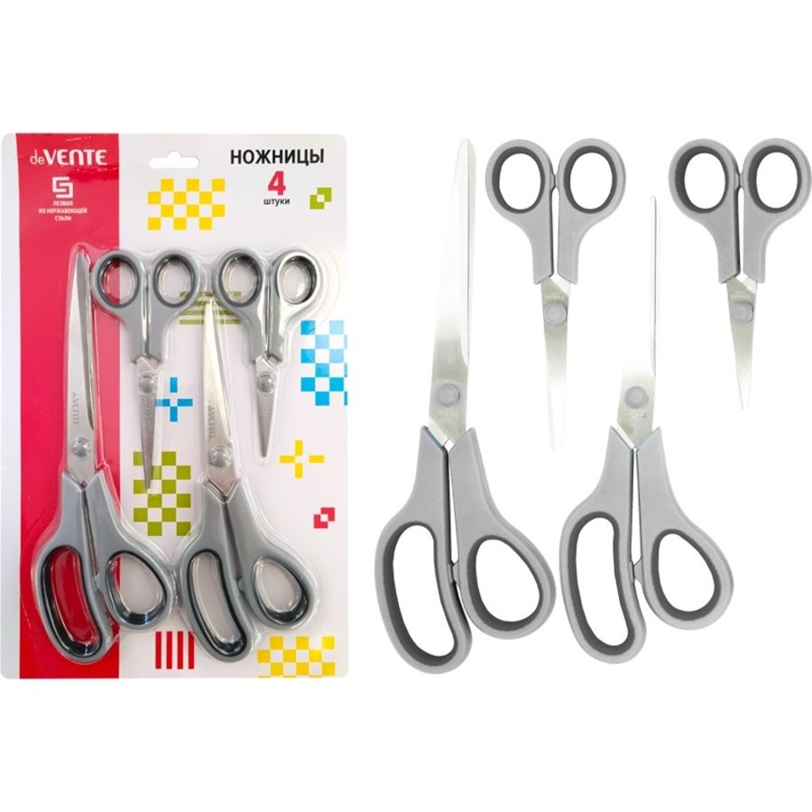 Набор ножниц канцелярских "deVENTE" 4 шт, длина 12,2 см, 14 см, 21 см и 24 см, лезвия из нержавеющей стали, двухцветные прорезиненные кольца, в картонном блистере