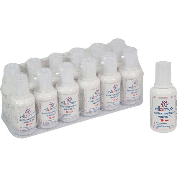 Корректирующая жидкость "Attomex" 16 мл, быстросохнущая, в бутылочке с кисточкой, в пластиковом поддоне