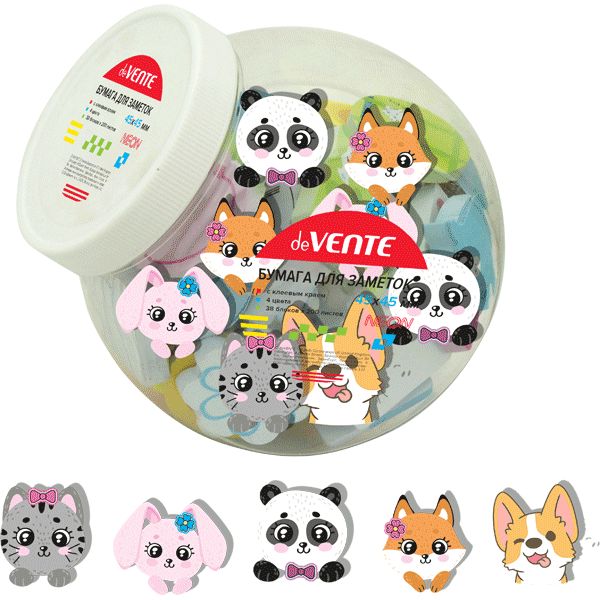 Клейкая бумага для заметок "deVENTE. 100% Cute" 45x45 мм, 50 листов, офсет 80 г/м², печать 4+0, 5 дизайнов, в пластиковой банке