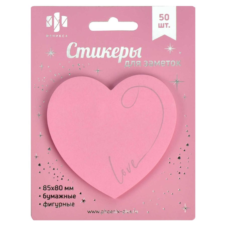 Стикеры для заметок бумажные, 85х80 мм, 50 шт., арт. 65174 / 25 СЕРДЦЕ РОЗОВОЕ (материал: дизайнерская бумага 80 г/м², цвет: розовый; кол-во цветов: 1, кол-во каждого цвета: 50, форма: фигурная, декор: тиснение фольгой; наличие диспенсера: нет, особенности: фигурная вырубка; индивидуальная упаковка: подложка с европодвесом из мелованного картона + ПЭТ-пакет)