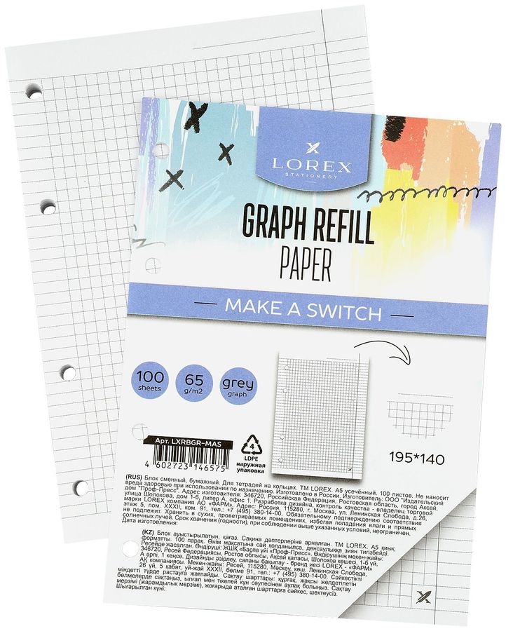 Сменный блок LOREX GRAPH для тетрадей на кольцах для тех, кто хочет выделяться! Линовка блока - приятная серая клетка. Количество листов в комплекте 100 штук - их точно хватит надолго. Формат листов А5 усеченный (195*140 мм). Данный формат идеально подходит под тетради на кольцах LOREX. Делай так, как тебе нравится! Комбинируй, выделяйся!