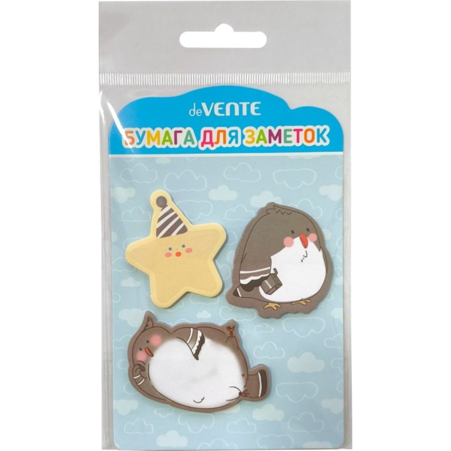 Набор клейкой бумаги для заметок "deVENTE. Gray Birds" 41x41 мм и 50x50 мм, 3x20 листов, офсет 80 г/м², печать 4+0, ассорти форм, 3 дизайна, в картонном блистере и пластиковом пакете с европодвесом