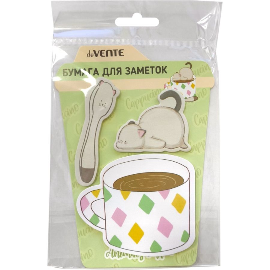 Набор клейкой бумаги для заметок "deVENTE. Animals Coffee. Cat" 80x68 мм, 72x23 мм и 54x35 мм, 3x20 листов, офсет 80 г/м², печать 4+0, ассорти форм, 3 дизайна, в картонном блистере и пластиковом пакете с европодвесом