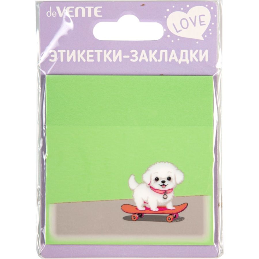 Самоклеящиеся этикетки-закладки "deVENTE. Puppy" пластиковые полупрозрачные, с дизайном, 76x76 мм, 50 листов, печать 4+0, в картонном блистере и пластиковом пакете с европодвесом, мятные