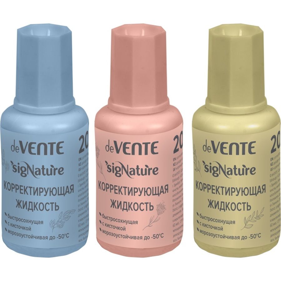 Корректирующая жидкость "deVENTE. sigNATURE" 20 мл, быстросохнущая, в бутылочке с кисточкой, цвета корпуса ассорти (оливковый, пудрово-розовый, сумеречный синий), в пластиковом поддоне