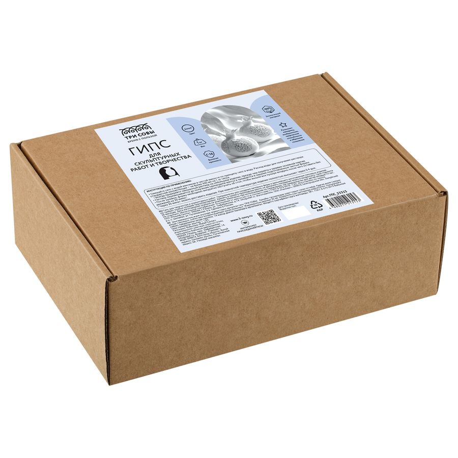 Гипс для творчества, художественных и скульптурных работ. Белый гипс предназначен для создания литейных форм, скульптурных изделий, декоративных элементов для рамок и аксессуаров, магнитов, подсвечников, 3D слепков, отпечатков ладошек и ступней. В картонной коробке 1 кг.Гипс «ТРИ СОВЫ» – классический скульптурно-художественный гипс. Экологичный, природный материал имеет высокую прочность Г-16 и пластичность. Он позволяет создавать изделия высокого художественного уровня. Благодаря мелкому помолу без вкраплений, гипсовый раствор заполняет даже самые маленькие формы и детали. При замешивании гипс не образует пузырьков. Законченное изделие отличается высокой прочностью, белизной, гладкой и ровной поверхностью, которую удобно покрывать красочным слоем. Не крошится.Занятия с гипсом, создание и раскрашивание фигурок набирают популярность и вызывают большой интерес как у взрослых, так и детей. Гипс «ТРИ СОВЫ» поможет воплотить все ваши идеи, а также будет способствовать развитию образного, пространственного мышления и фантазии.«ТРИ СОВЫ» – время с пользой!