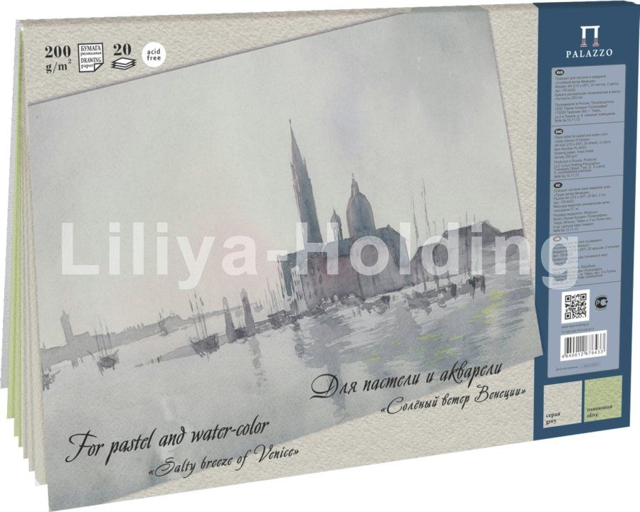 Планшет для пастели и акварели "Соленый ветер Венеции" А-4, рисовальная бумага цветная, плотность 200г/м2, 20 листов (10 листов серого цвета и 10 листов оливкового цвета).
