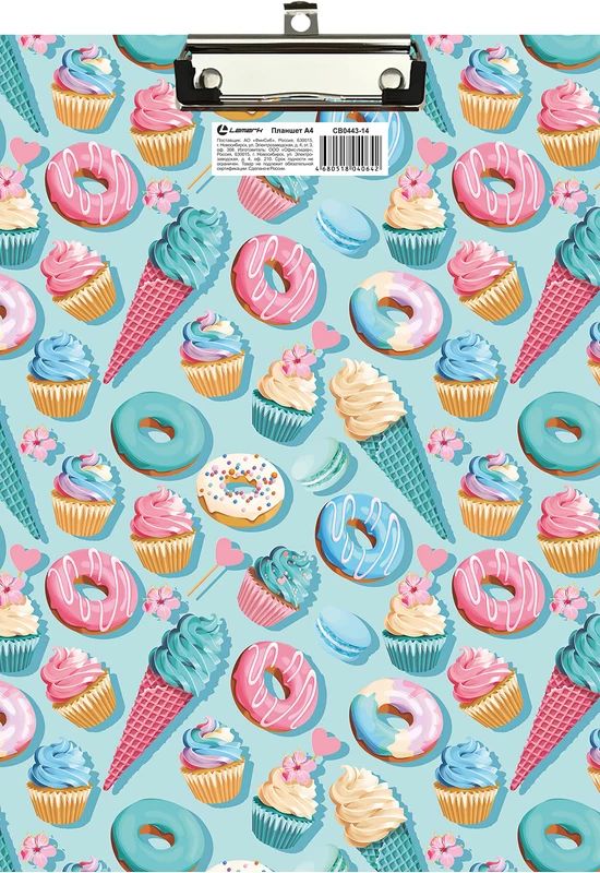 Планшет Lamark c верхним металлическим зажимом выполнен из плотного картона толщиной 2 мм, оклеенного бумагой с ярким принтом "Сладкий рай" с двух сторон. Глянцевая ламинация. Для документов формата А4. Механизм: еврофурнитура, зажим с европодвесом, с пластмассовыми уголками. Удобно работать с документами/зарисовками на весу. Широкое применение: для выступлений, докладов; для работы на конференциях, корпоративных мероприятиях, выставках; для работников склада, экспедиторов, торговых представителей.