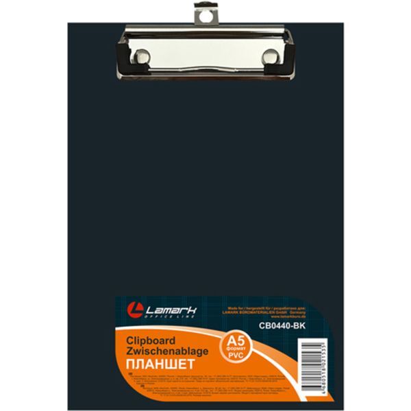 Планшет (клипборд) ТМ "Lamark" с верхним металлическим зажимом. Формат А5. Поможет расположить и зафиксировать необходимые бумаги без перфорации в нужном вам порядке, а также осуществлять комфортную запись на весу. Прижимной механизм с европодвесом и пластмассовыми уголками надёжно удержит листы без дополнительного вспомогательного инструментария. Рабочее поле выполнено из плотного картона толщиной 2 мм, с износоустойчивым PVC покрытием. Используется на публичных выступлениях, совещаниях, конференциях, в работе на складах, в торговле, логистике и прочее.