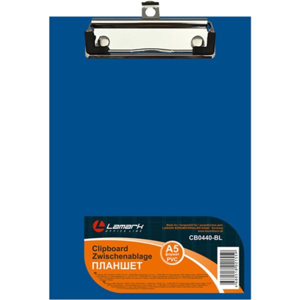 Планшет (клипборд) ТМ "Lamark" с верхним металлическим зажимом. Формат А5. Поможет расположить и зафиксировать необходимые бумаги без перфорации в нужном вам порядке, а также осуществлять комфортную запись на весу. Прижимной механизм с европодвесом и пластмассовыми уголками надёжно удержит листы без дополнительного вспомогательного инструментария. Рабочее поле выполнено из плотного картона толщиной 2 мм, с износоустойчивым PVC покрытием. Используется на публичных выступлениях, совещаниях, конференциях, в работе на складах, в торговле, логистике и прочее.