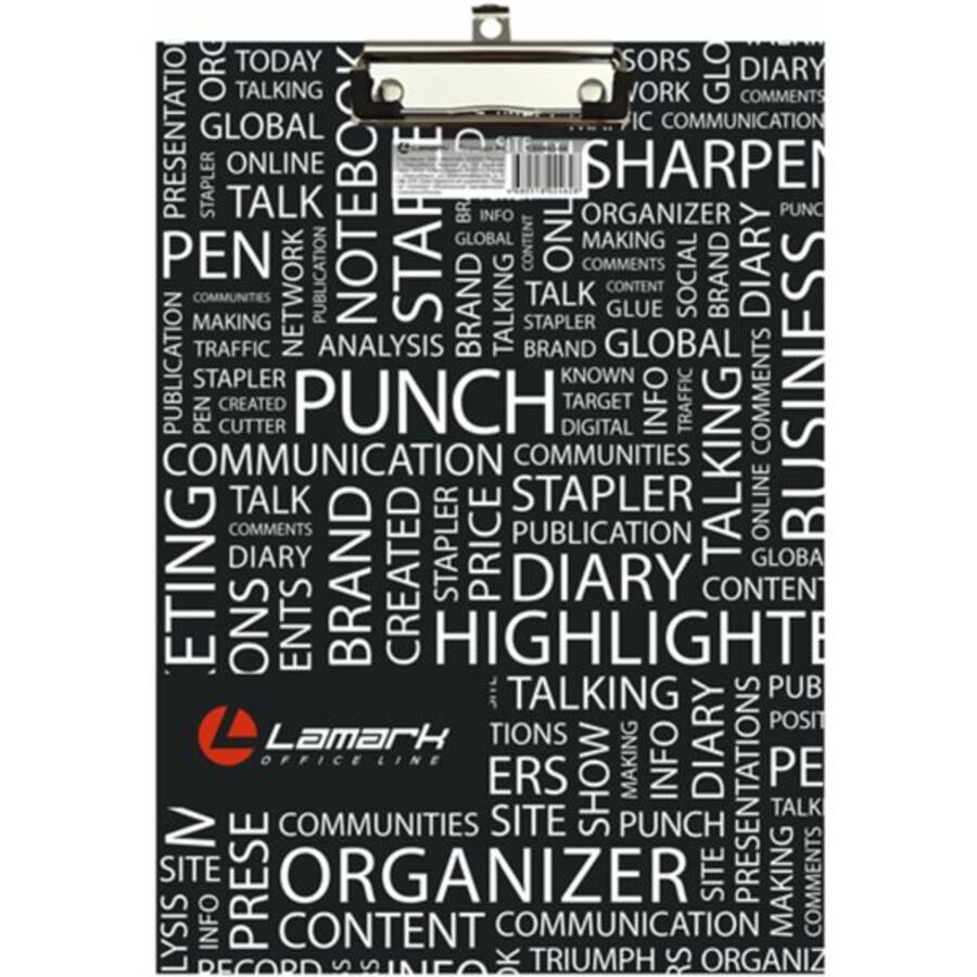 Планшет Lamark c верхним металлическим зажимом выполнен из плотного картона толщиной 2 мм, оклеенного бумагой с Буквенным принтом с двух сторон. Матовая ламинация. Для документов формата А4. Механизм: еврофурнитура, зажим с европодвесом, с пластмассовыми уголками. Широкое применение: для выступлений, докладов; для работы на конференциях, корпоративных мероприятиях