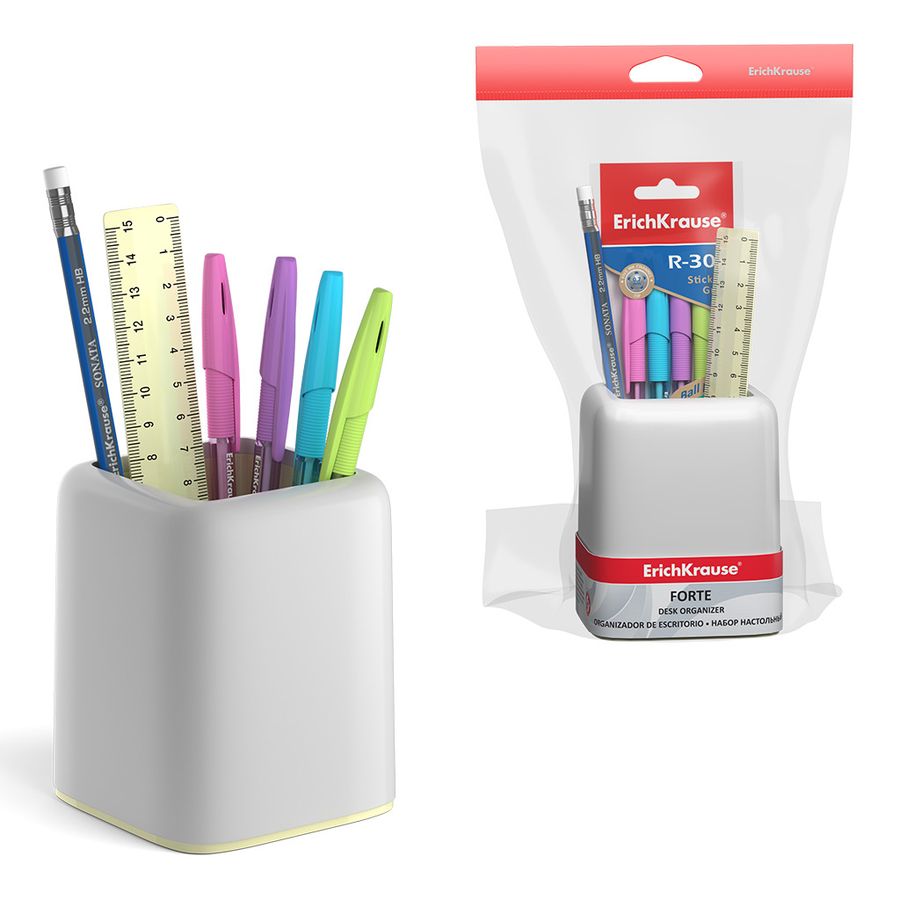 Лаконичность и элегантность дизайна коллекции Forte проявились и в таком аксессуаре для рабочего стола, как подставка для пишущих принадлежностей. В комплекте 6 предметов: 4 ручки, карандаш, линейка. Наполнение может отличаться от представленного.