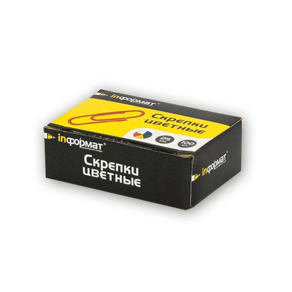 Скрепки канцелярские с цветным виниловым покрытием. Скрепки представлены в двух видах упаковки: в картонной коробке и фирменном пластиковом боксе. Бокс снабжен европодвесом. В наборах по 50 и 100 штук. В ассортименте цветные скрепки 25, 28 и 50 мм.
