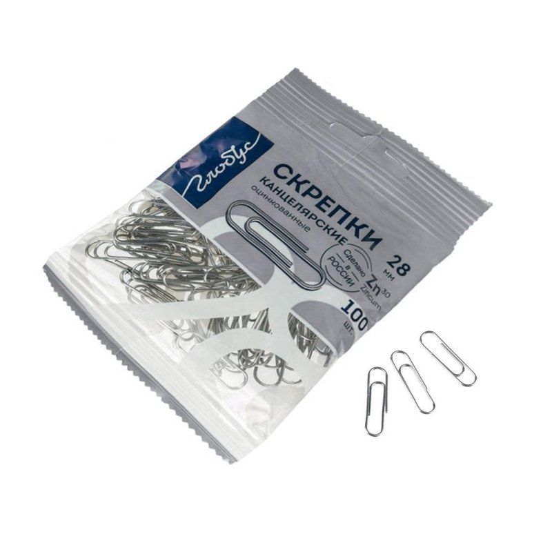 Скрепки оцинкованные в пакете с европодвесом. Флоу-пак. Металлические скрепки надежно скрепляют документы, не повреждая бумагу. Скрепки имеют размер 28 мм. В пакете 100 скрепок.
