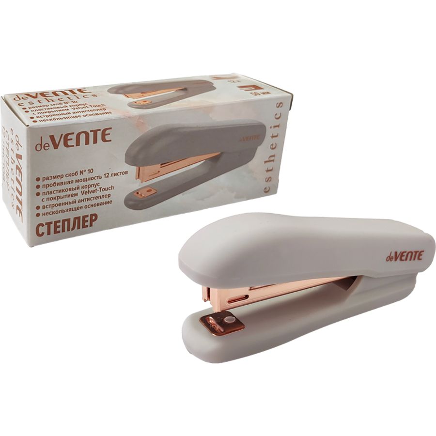Степлер "deVENTE. Esthetics" № 10 (мощность 12 листов, глубина скрепления 50 мм) пластиковый, c покрытием Velvet Touch, со встроенным антистеплером, в картонной коробке, цвет лавандово-пепельный, мета 4142520