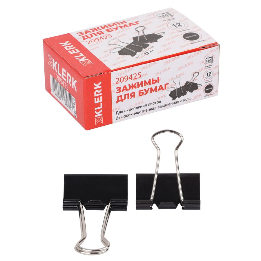 Зажимы для бумаг 32 мм, набор 12 шт, цвет черный, картонная коробка KLERK 209425