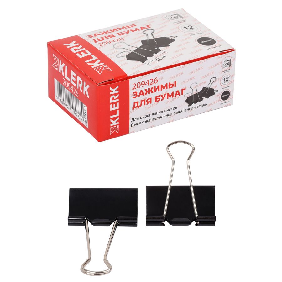 Зажимы для бумаг 41 мм, набор 12 шт, цвет черный, картонная коробка KLERK 209426