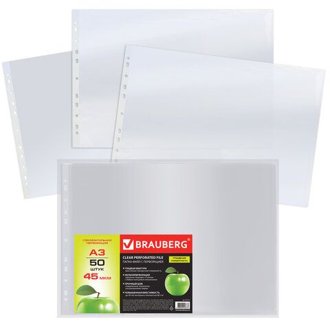 Описание Горизонтальные перфорированные папки-файлы BRAUBERG предназначены для хранения документов и подходят для подшивки в папки с любым кольцевым механизмом и скоросшивателем. Перфопапки формата А3 с горизонтальным размещением содержат универсальную перфорацию, а также имеют гладкую поверхность и прочные швы. Толщина пленки - 45 мкм, что подходит для хранения документов - до 20 листов. Данный товар относится к среднему ценовому сегменту. С папками-файлами BRAUBERG выполнять повседневные задачи станет проще, чем когда-либо!