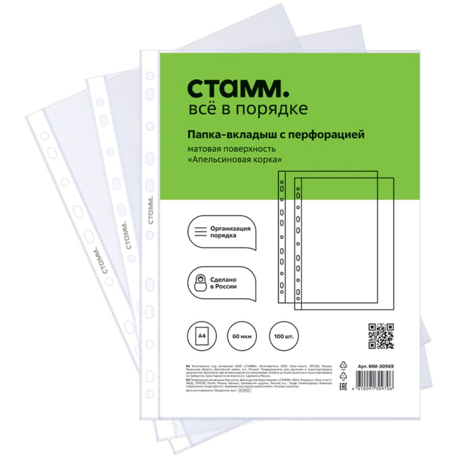 Папка-вкладыш с перфорацией «СТАММ» отлично подойдет хранения и систематизации документов. Папка размером 305*235 мм изготовлена из полипропилена толщиной 60 мкм. Папка вмещает до 50 листов. Имеет текстуру "апельсиновая корка", защищает листы от внешних воздействий. Перфорация на боковой части позволяет разместить изделие в папке с любым кольцевым механизмом или скоросшивателе. Упакованы в пакет по 100 штук.• Размер: 305*235 мм;• Вместимость, в листах: 50;• Формат: А4;• Цвет: прозрачный
