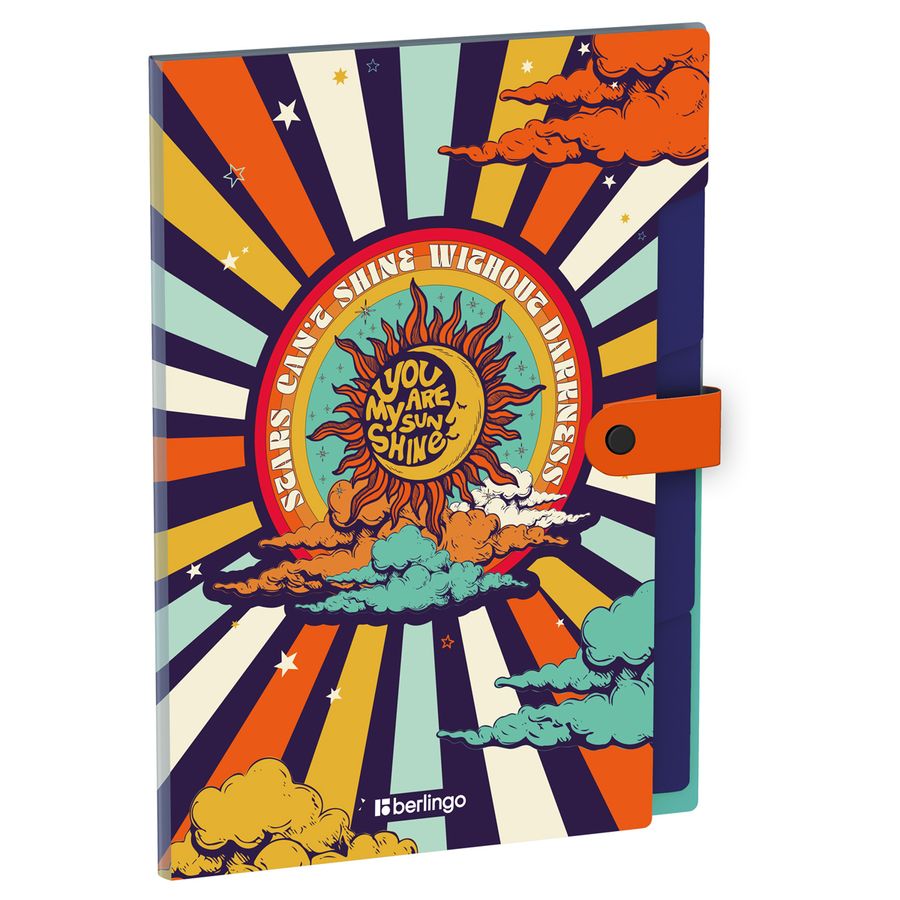 Папка на 5 отделений Berlingo Groovy для удобного хранения и организации документов. Каждое отделение с индексным полем, позволяет сортировать документы по темам или алфавиту. Надежная застежка-кнопка обеспечит быстрый доступ к содержимому. Толщина обложки – 600 мкм. Вмещает до 200 листов. Размер – 245*325*10. Яркий дизайн коллекционной серии Berlingo Groovy. Изготовлена из высококачественного полипропилена с матовой текстурой поверхности «песок», на которой не видно отпечатков пальцев и мелких царапин. Папка формата А4 – это функциональный аксессуар для работы и учебы, предназначена для транспортировки, упорядочивания и хранения бумаг. Снабжена встроенными индексными разделителями, которые позволяют легко найти нужные документы. Индивидуальная упаковка в пакет.• Формат: А4;• Цвет: рисунок.