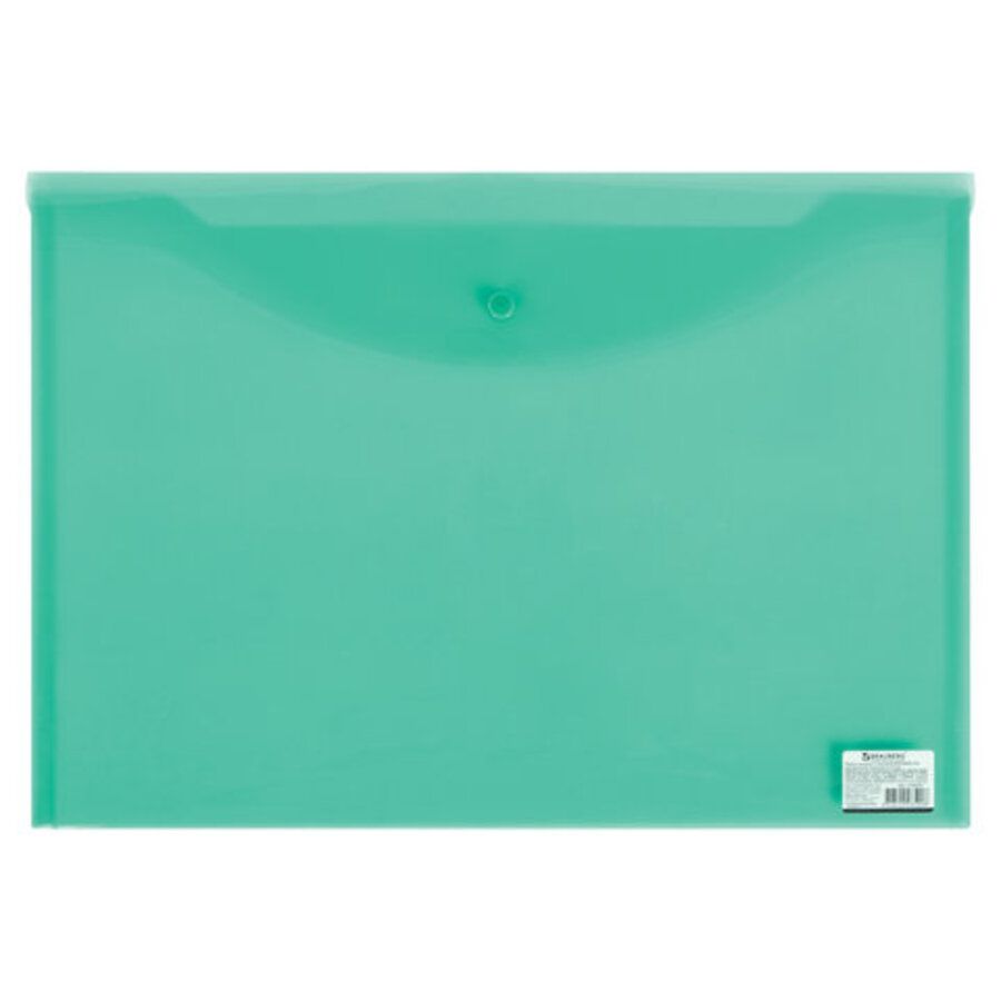 Папка-конверт с гладкой фактурой размера А3 изготовлена из плотного прозрачного пластика зеленого цвета толщиной 180 мкм. Закрывается на защелку-кнопку, что делает удобным частое использование и обеспечивает быстрый доступ к ее содержимому. Папка способна вместить до 100 листов стандартной плотности.