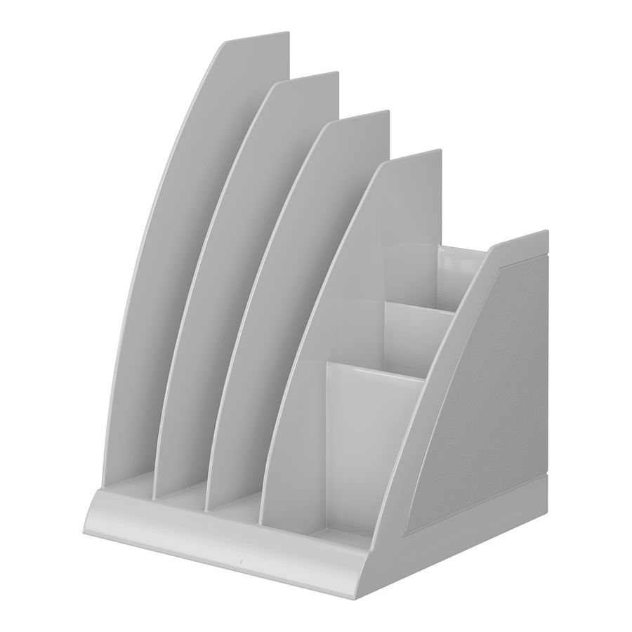 Настольная подставка с отдельными секциями для хранения как документов, журналов и каталогов любого формата, так и канцелярских принадлежностей. Изготовлена из высококачественного пластика.