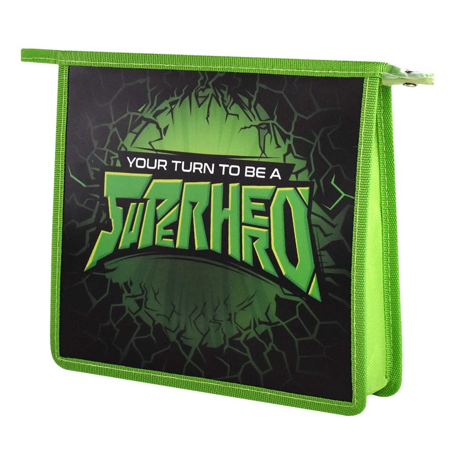 Папка для школьных тетрадей. СУПЕР ГЕРОЙ. Формат А5. Размер: 23.3x20х6.5 см. Материал: полипропилен. Толщина: 500 мкм. Количество отделений - 1 отделение , Тип застёжки: молния. Цвет: зелёный, чёрный. Особенности: дно с расширением.