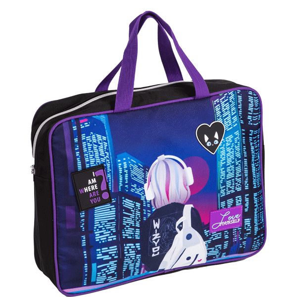 Папка для тетрадей, ИЗО и технологии "deVENTE. City Girl" A4 (36x28x8 см) текстильная с каучуковой аппликацией, с текстильным расширением 8 см, на молнии сверху, каучуковая аппликация, с внутренним карманом, с подкладом, с текстильными ручками увеличенной длины 28 см, окно и именная карточка для подписи
