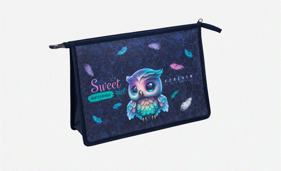Папка для тетрадей "deVENTE. Happy Owl" A4 (330x230x100 мм) с текстильным расширением 100 мм, на молнии сверху, 400 мкм, матовая полупрозрачная с рисунком, с волокнистой фактурой, индивидуальная упаковка.