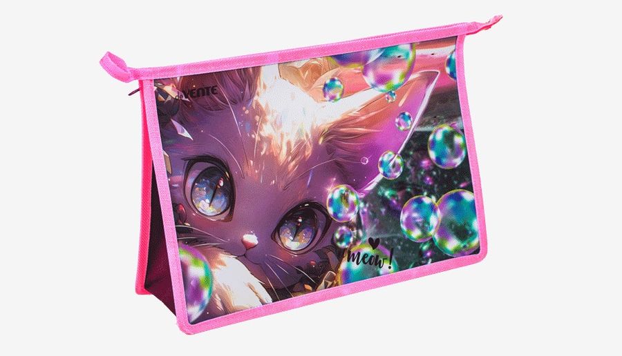 Папка для тетрадей "deVENTE. Lovely Cat" A4 (330x230x100 мм) с текстильным расширением 100 мм, на молнии сверху, 400 мкм, непрозрачная с рисунком, фактура песок, индивидуальная упаковка.