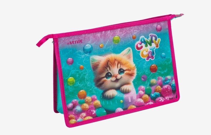 Папка для тетрадей "deVENTE. Candy Cat" A4 (330x230x100 мм) с текстильным расширением 100 мм, на молнии сверху, 400 мкм, матовая полупрозрачная с рисунком, с волокнистой фактурой, индивидуальная упаковка.