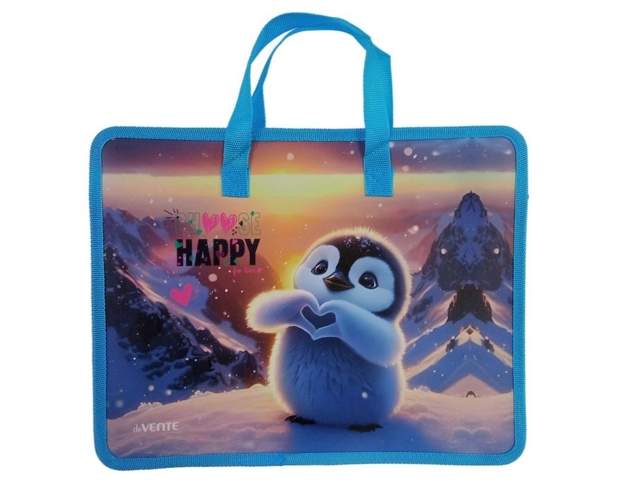 Папка для тетрадей, ИЗО и технологии "deVENTE. Happy Pinguin" A4 (33,5x26x10 см) с текстильным расширением 10 см, на молнии сверху, пластик 400 мкм, текстильные ручки, в пластиковом пакете