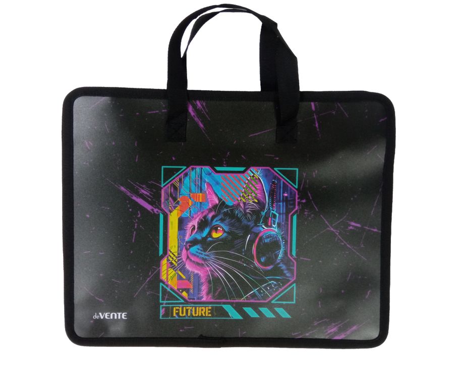 Папка для тетрадей, ИЗО и технологии "deVENTE. Label. Cyber Cat" A4 (33,5x26x10 см) с текстильным расширением 10 см, на молнии сверху, пластик 400 мкм, текстильные ручки, в пластиковом пакете