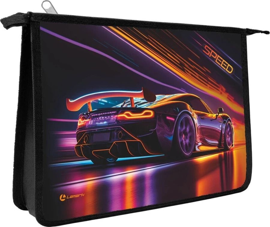 Папка для тетрадей Lamark "Скорость", А4, Размер 340х245 мм, текстильное расширение 50 мм. Молния сверху. Ламинированный картон с объемным тиснением. Рисунок с двух сторон папки.